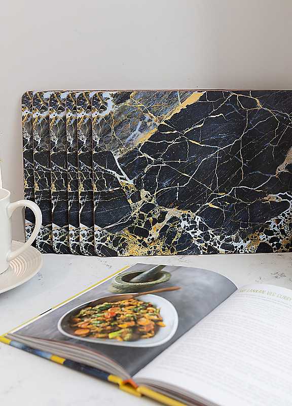Protect your table with this fantastic set of six cork-backed placemats, which feature a stunning, navy, marble-effect print. The deep, twilight colour is broken by delicate creases in natural shades of gold and grey. There are six table mats included: ideal for dinner parties and wine and cheese tasting with friends, or simply for brightening up every day dining after a dreary day. Simple, but beautiful, they'll blend in easily on the family dinner table, beneath dinner plates brimming with exquisite, home-cooked food. Combine your set of six large table placemats with the coordinating, larger set of four, measuring 40 x 29 cm (15½ x 11½ inches) (5233719). There is a round serving tray (5233659) too, if you'd like to have a full set. Why not treat your own table, or give them as a gift? They would make a lovely present for housewarming or wedding parties.Wipe clean onlyWood - MDF0.5 x 22.7 x 30cm