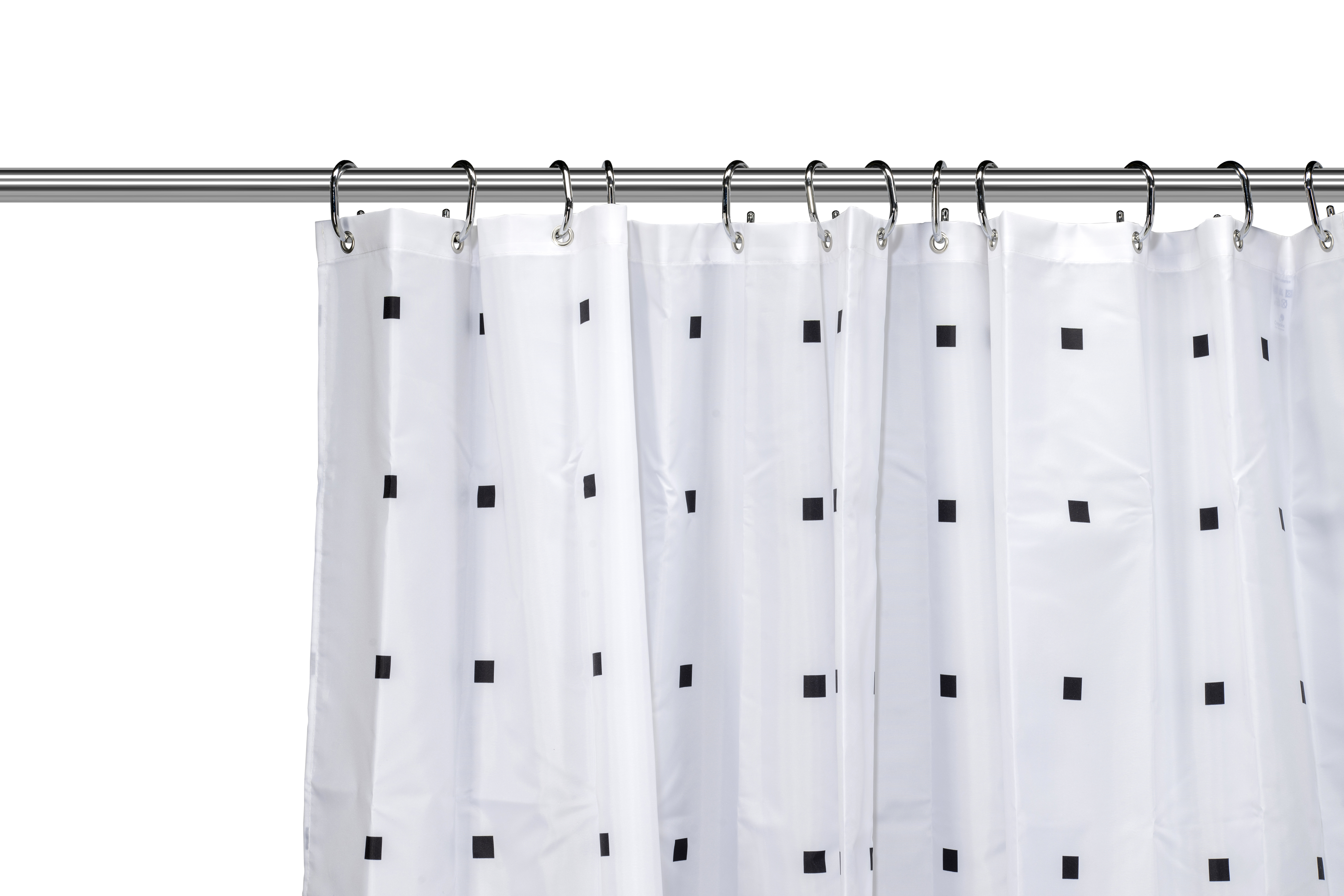 Croydex Squares Shower Curtain - White/Black - Add a crisp, modern edge to your bathroom with this striking textile shower curtain. Made from durable, water-repellent fabric and ready to hang with tear-resistant eyelets, it offers an effortless refresh. A weighted hem keeps the curtain in place, ending the hassle of mid-shower cling. Featuring a clean white backdrop with bold black square dots, this minimalist design brings a playful yet polished touch to your space.