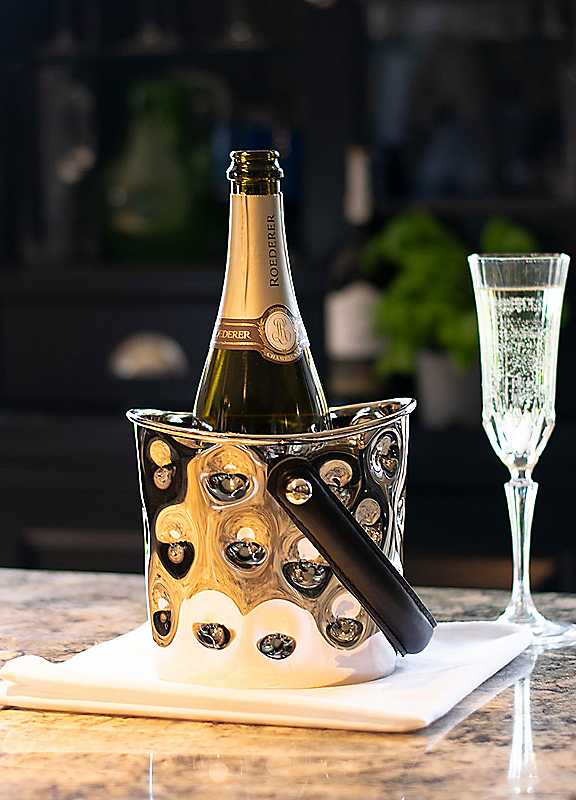 Indulge in the epitome of sophistication with our Polo Bottle Cooler, meticulously crafted to add a touch of glamour to any occasion. The stainless steel exterior, adorned with voluminous dimples that gracefully catch the light, creates a visual spectacle. Paired with luxurious black leather handles and contrasting white stitching, this cooler is a statement piece that effortlessly blends functionality with timeless style.Stainless steel and leatherHandwash onlyTowel dryNot microwave or dishwasher safe