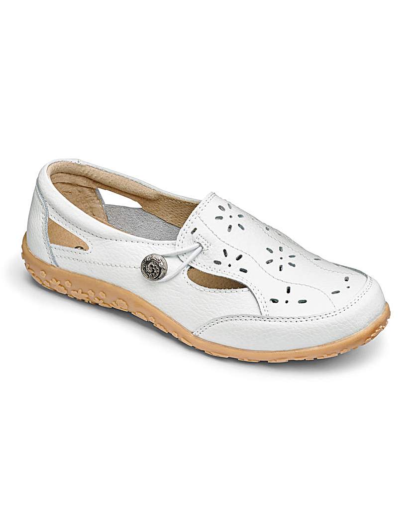 These cut-out-detail leather shoes from Cushion Walk are available in an array of colours to complement any outfit. Soft leather uppers, linings and flexible soles offer all-round foot comfort. Elastic loop and metal button detail for easy foot entry.