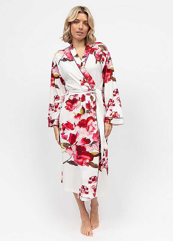 Wrap yourself in elegance with this lightweight floral robe. Featuring a vibrant red and pink blossom print on a soft white backdrop. It's designed with a relaxed fit and tie waist for effortless comfort. Perfect for lounging, getting ready and adding a touch of luxury to your bedtime apparel.Machine washable52% Cotton, 41% ModalĀ®, 7% ElastaneKeep away from fire.ModalĀ® is a registered trademark.