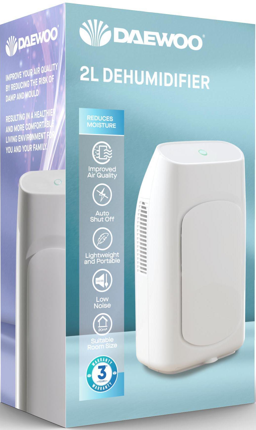 Helps prevent condensation, mould, and damp issues Energy efficient - just 1p/hour based on 24.86p/kWh Portable and lightweight design 2L water tank - full tank indicator and auto shut-off 750ml moisture extraction over 24hrs Low noise level - 42db For rooms up to 20m² 40W power 3 year extended warranty (online registration) Dimensions: 37.2H x 22.8W x 15D cm Weight: 2.63 kg