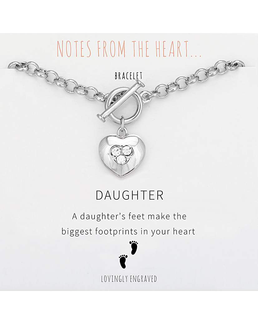 Daughter Heart T Bar Bracelet Rhodium Plated Message: A daughter's feet make the biggest footprints in your heart Message Delicately Engraved On Reverse Of Bracelet Chain length:18cm Presented in a gift bag