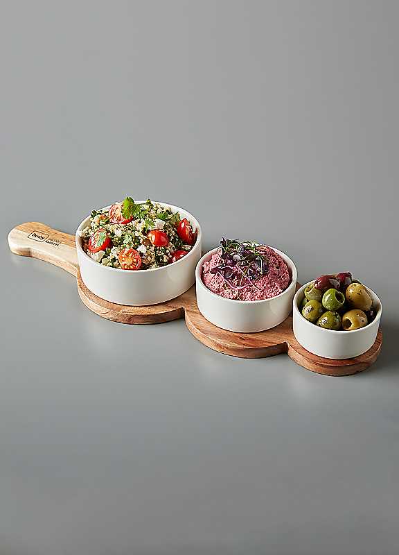 Versatile and stylish, whether it be for bite sized nibbles, olives or dips. The 4 piece serving set includes an acacia serving board and 3 porcelain bowls perfect for weekends, gatherings and parties. Bringing together James's passion for food and Denby's expertise in serving and dining.Care Instructions: Bowls are dishwasher, microwave, freezer and oven safeWooden board is handwash onlyMaterial: Bowls PorcelainBoard Acacia WoodPorcelain/Acacia WoodBoard: 29.5 cmSmall Bowl: 7.5 x 3.5 cmMedium Bowl: 9 x 3.8 cmLarge Bowl 11.5 x 4.4 cm
