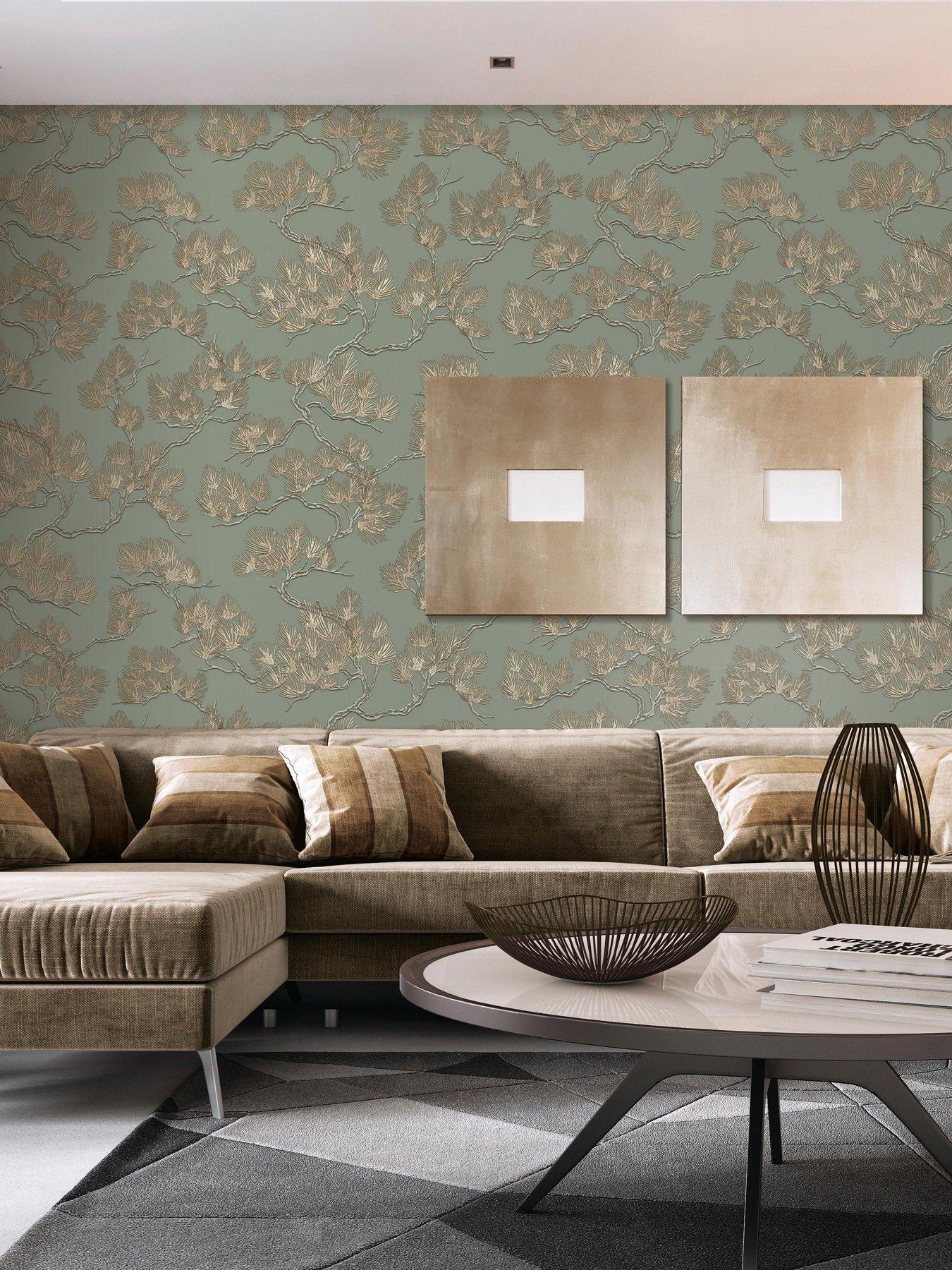 Design Id Wall Fabric Pine Tree Wallpaper - Sage/Gold