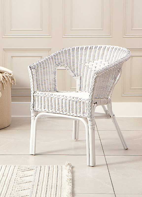 The Natural Small Adults Loom Armchair is a beautifully crafted piece made from natural rattan cane. Its compact design makes it a perfect addition to conservatories, bedrooms, or any living space, offering timeless style and versatility. A great space-saving solution, this chair works equally well as a standalone piece or as an addition to larger furniture sets. While suitable for outdoor use, it must be kept dry. Designed for convenience, it is also stackable, allowing you to easily store multiple chairs when not in use. Elegant, practical and versatile, the Small Loom Armchair is the ideal blend of style and function for any home.Weight of product: 9 kgReady assembledManufacturer's 1 year guaranteeWipe clean only, avoid household cleaners/abrasivesRattan, Wicker & CaneDimensions approx. 72H x 58W x 55D cmPlease remember to measure your available space before ordering. If using on an un-carpeted floor we recommend rubber or felt protection pads be used under the legs to avoid damage to your floors. | wicker bar stool with back, white arm chair, arm chair for small spaces, stackable bar stools, white occasional chair, wooden arm armchair, white chair with wooden legs, light wood armchair, small living room chairs, small arm chair
