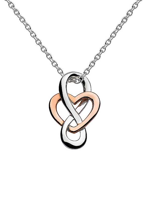 This traditional and intricate sterling silver heart necklace is inspired by the Celtic themes of love, friendship and loyalty. Detailed in 14ct rose gold, the central heart delicately twists in between the classic figure-of-eight infinity knot, making this necklace an elegant symbol of that special and unbreakable bond, suspended on a simple sterling silver 18-inch curb chain. Brand: Dew Gift boxed Material: 925 Sterling silver & 14ct rose gold plate Fastening: Spring ring clasp Length approx. 45.7 cm (18 in) | heart pendant necklace, sterling silver heart necklace, claddagh necklace, silver heart necklace, celtic knot necklaces, rose gold heart necklace
