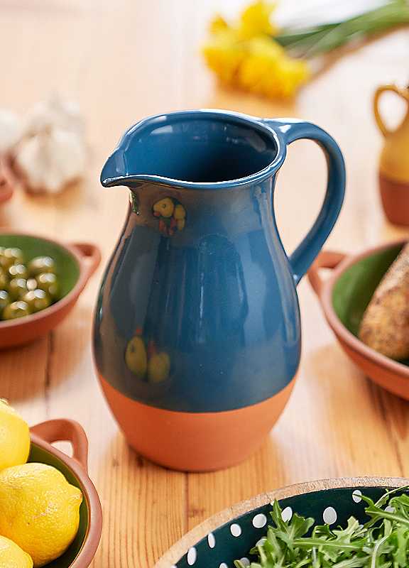A tall terracotta jug perfect for a fresh lemonade, juice or sauces.This beautiful green glazed terracotta jug is one of many products in our sintra collection, inspired by the richness of the architecture and surrounding landscape of sintra, in Portugal. Perfect as a vehicle for a fresh lemonade, juices or sauces. Made from 100% terracotta with a hand finished glaze. Due to the nature of the glazing each piece is beautifully individual with possible variances in shade from piece to piece.This jug has an easy pour spout to pour liquids with less spillage. One of five colours in this collection. Enjoy mediterranean style outdoor dining with our matching multi-coloured glazed terracotta pieces. Explore the full sintra collection and bring colour and vibrance to any table!Hand finished colour glazeCapacity approx. 3LPerfect for outdoor diningCeramic