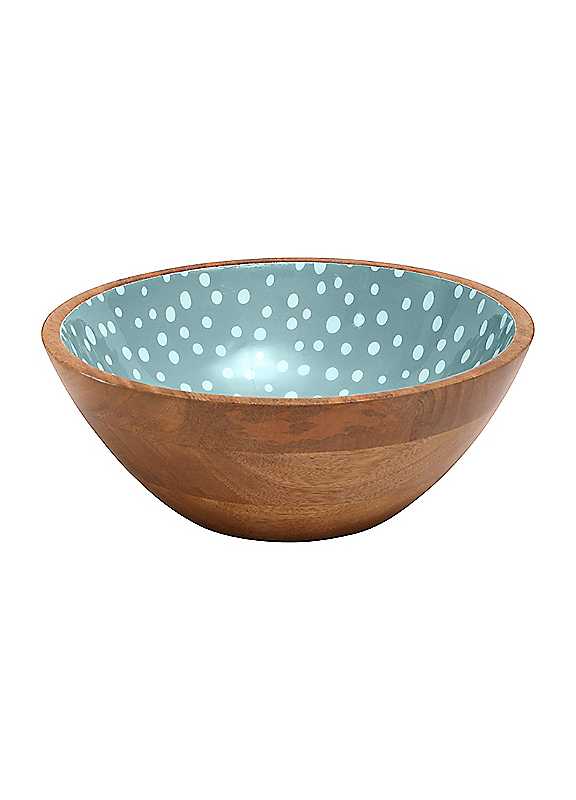 Serve your salad in style with this eco-friendly mango wood salad bowl. Enamelled with a duck egg hand finished spotted design. Made from eco-friendly, sustainable mango wood and enamelled with a hand finished design. Mango trees are grown for their fruit but as the tree matures it becomes barren, so farmers have to plant new trees every 7 - 15 years. Only the older, less fruitful trees are chopped down for the mango wood. Enjoy mediterranean style outdoor dining with our mango wood salad bowl and shop our servers to complete the set!Inspired by the beautiful town of sintra in Portugal, this collection reflects the magic and mystery of the place. One of five colours in this collection all inspired by the richness of the architecture and surrounding landscape of sintra. Explore our full sintra collection and bring colour and vibrance to any table!Made from eco-friendly, sustainable mango woodEnamelled, hand finished interiorPerfect for outdoor dining & entertainingServe your salad in style with this stunning duck egg mango wood bowlWood