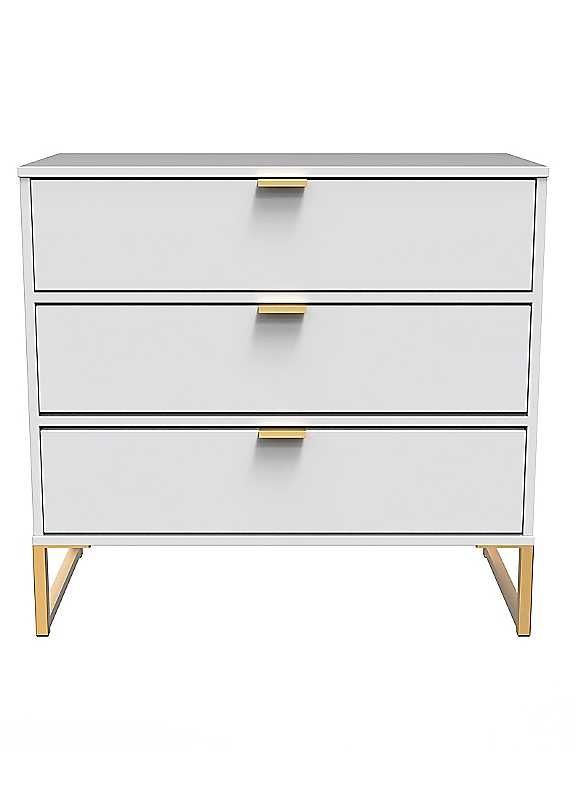 This modern storage cabinet features 3 large storage drawers. A truly unique style that will be the highlight of any bedroom. This furniture set is popular for its Scandinavian style and industrial feel. Constructed from sturdy materials with metal handles and frame legs. Elevate your space with this range featuring plenty of storage so it's incredibly practical for keeping rooms clutter free and tidy. All our furniture is made to order in the United Kingdom to the highest quality. Furniture comes fully assembled (although legs may be removed to prevent damage in transit).Ready Assembled Weight Capacity: 30kgSpecifications Material: MFC & MDFManufacturer's 1 year guaranteeProduct Care: Wipe clean onlyMade in the UKWeight of product 28.7kgWall Anchor kit includedOverall Assembled Dimensions Hx73 Wx76 Dx40cmSpecification Leg Material: Metal