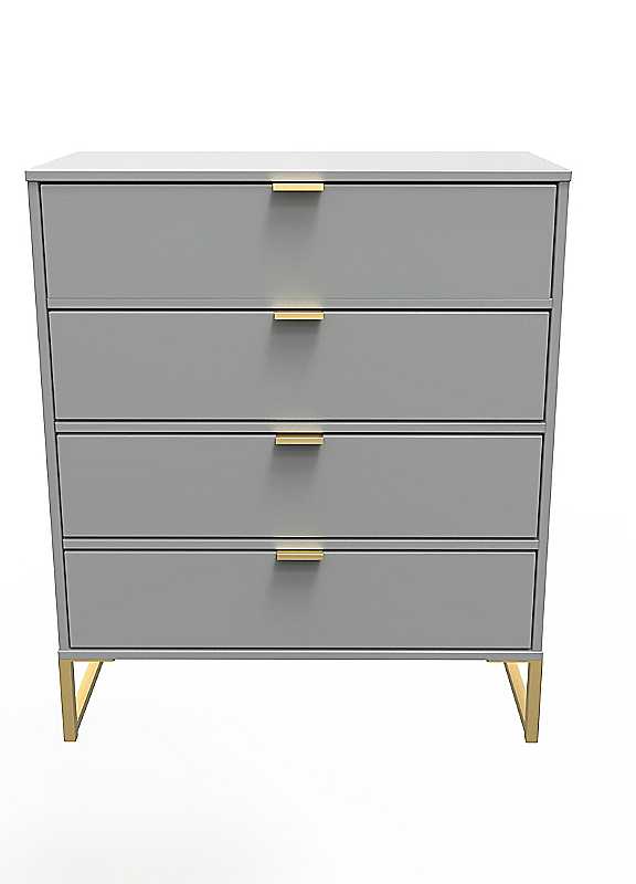 This modern storage cabinet features 4 large storage drawers. A truly unique style that will be the highlight of any bedroom. This furniture set is popular for its Scandinavian style and industrial feel. Constructed from sturdy materials with metal handles and frame legs. Elevate your space with this range featuring plenty of storage so it's incredibly practical for keeping rooms clutter free and tidy. All our furniture is made to order in the United Kingdom to the highest quality. Furniture comes fully assembled (although legs may be removed to prevent damage in transit).Ready Assembled Weight Capacity: 30kgSpecifications Material: MFC & MDFManufacturer's 1 year guaranteeProduct Care: Wipe clean onlyMade in the UKWeight of product 37kgWall Anchor kit includedOverall Assembled Dimensions Hx91 Wx76 Dx40cmSpecification Leg Material: Metal