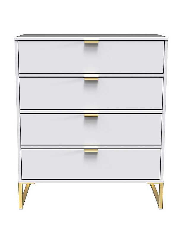 This modern storage cabinet features 4 large storage drawers. A truly unique style that will be the highlight of any bedroom. This furniture set is popular for its Scandinavian style and industrial feel. Constructed from sturdy materials with metal handles and frame legs. Elevate your space with this range featuring plenty of storage so it's incredibly practical for keeping rooms clutter free and tidy. All our furniture is made to order in the United Kingdom to the highest quality. Furniture comes fully assembled (although legs may be removed to prevent damage in transit).Ready Assembled Weight Capacity: 30kgSpecifications Material: MFC & MDFManufacturer's 1 year guaranteeProduct Care: Wipe clean onlyMade in the UKWeight of product 37kgWall Anchor kit includedOverall Assembled Dimensions Hx91 Wx76 Dx40cmSpecification Leg Material: Metal
