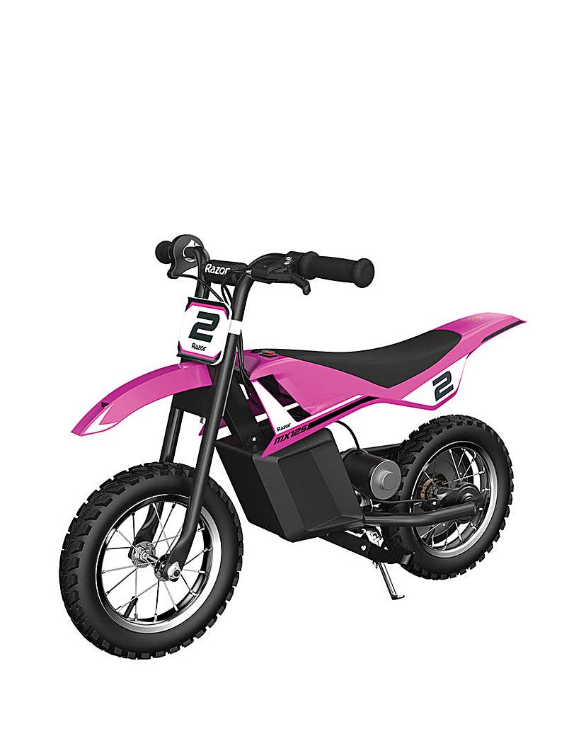 The Mx125 Dirt Rocket is your intro to adventure, offering the adrenaline pumping fun of off-road riding in a scaled-down size designed for dirt bike riders ages 7 and up. Razors smallest electric-powered dirt bike, the Mx125 helps younger riders build confidence on dirt, delivering top-notch performance with authentic MX-frame geometry, motocross-style knobby 12inch tyres and twist-grip throttle for a true-to-life dirt bike ride. Rear-wheel drive delivers better weight and balance control for greater safety and stability, while the high-torque, chain-driven electric motor powers riders up to 8 mph (13 km/h) for up to 40 minutes of continuous use. Its the perfect introduction to the excitement and adventure of off-road riding.