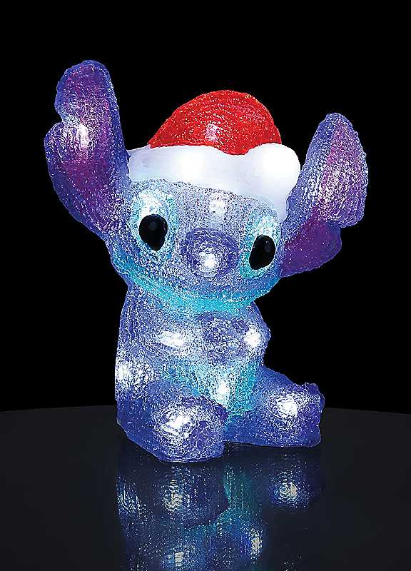 Add a touch of extraterrestrial magic to your Christmas decor with this charming light-up Stitch Sporting a festive Santa hat, its vibrant glow and playful design bring a unique flair to your celebrations. Perfect for brightening up any space, from cosy corners to festive centrepieces, this delightful small figure spreads joy and wonder. Let this Disney light up figurine become a standout piece in your holiday tradition, captivating guests with its whimsical charm and warm illumination. Battery Operated, 3xAA not included. Timer 6 hours on, 18 hours off. For indoor use only.