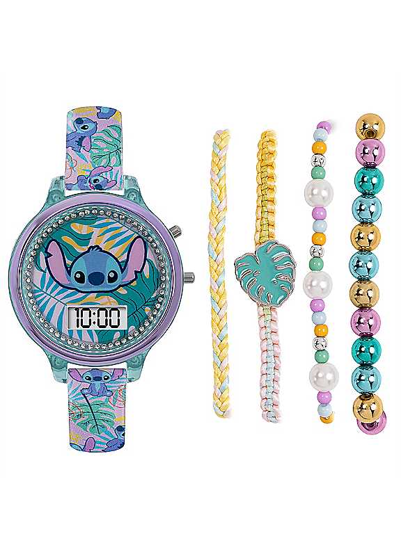 Disney Lilo and Stitch Watch and bracelet set. Featuring a character printed strap and dial with digital time display and a set of 4 colourful bracelets. Packaged in official branded packaging and comes with one year guarantee.Brand: Disney