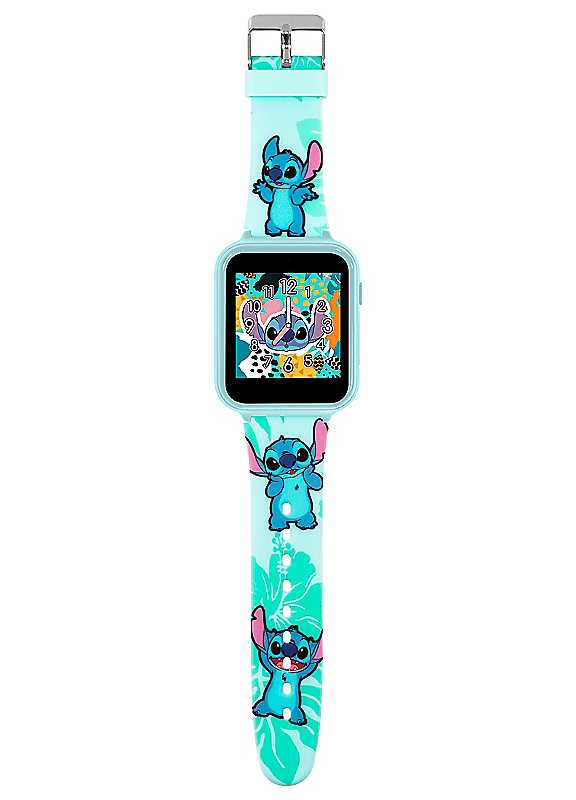 Disney Lilo & Stitch interactive watch with the printed soft silicone strap. The touch screen watch feature: 10 watch faces (5 analogue and 5 digital), selfie photo/video camera, games, fitness tracker, alarm/stopwatch/timer, voice recorder & calculator. USB cable supplied for charging and data download. Packaged in an official branded gift box and comes with one year guarantee. Brand: Disney Age suitability: 6+ Lilo & Stitch design touch screen dial Printed silicone strap with logo detail Touch screen Selfie photo/video camera, games, fitness tracker, alarm/stopwatch/timer, voice recorder & calculator Size approx. 22.3L x 4.1W x 1.3H cm THIS IS NOT A TOY. Do not dispose of batteries in fire, batteries may explode or leak. Do not replace the battery. Send to the service centre for replacement. Discontinue use if immersed in water. Do not wear it if the case back is missing or disassembled.