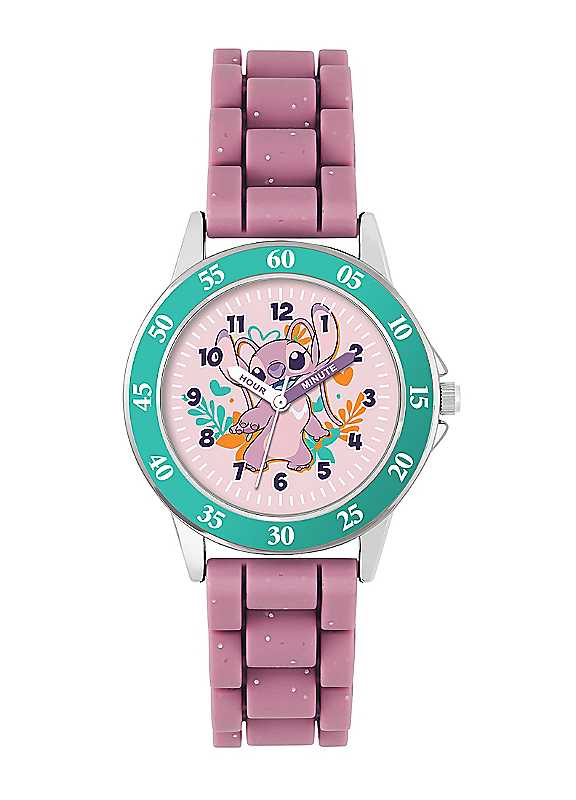 Disney Lilo & Stitch Angel Time Teacher watch with Angel Character printed dial, 3-hand analogue display, time-teaching feature, and pink soft silicone strap with traditional buckle fastening. Packaged in official branded packaging and comes with one year guarantee. Brand: Disney Angel character dial Time teaching feature Soft silicone strap Age Suitability: 6 Years+ WARNING: CHOKING HAZARD. Small Parts. Not for Children Under 3 Years. THIS IS NOT A TOY. Do not dispose of batteries in a fire, batteries may explode or leak. Do not replace the battery. Send to a service centre for replacement. Discontinue use if immersed in water. Do not wear if the case back is missing or disassembled. Suitable for ages 6 and up. | round watch, watch strap buckle, silver pink watch, pink dial watch, cartoon wrist watch, analog watch, silicone watch strap, pink childrens watch, casual wrist watch, disney stitch watch