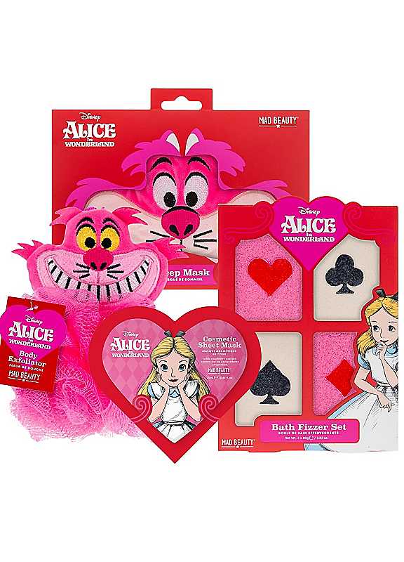Disney Alice in Wonderland Cheshire Cat Body Exfoliator:Leave yourself grinning from ear to ear as you lather up your favourite bathing product with the help of this Cheshire cat inspired body exfoliator.Disney Alice in Wonderland Bath Fizzer Set:Don't leave bath time down to a game of chance, ensure it's always as relaxing and refreshing as can be with these red raspberry and honeydew fragranced bath fizzers. Simply crumble the fizzer under running water and let the fruity aromas swirl and twirl through the air like a mad tea party for your senses.Disney Alice in Wonderland Cheshire Cat Sleep Mask:Tumble down the rabbit hole of restful slumber with this Cheshire Cat-inspired sleep mask, perfect for whisking you away to your own Wonderland of dreams. Just like a Cheshire grin fading into the night, this mask will block out light and distractions whilst the soft satin back will ensure a comfortable fit, with no Mad Hatters disturbing your dreamscape.Not suitable for children under 3. | bathing scrub brush, bath fizz balls, bath exfoliator, bath body scrubber, good sleep mask, exfoliating products