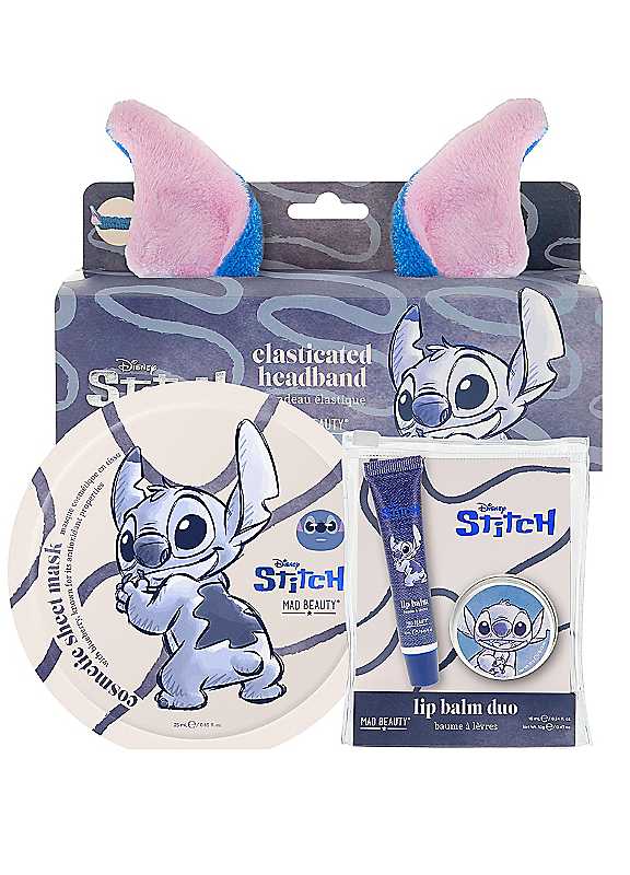 Cute yet oh so practical, this super soft Disney Stitch inspired headband comes complete with fluffy ears! Made from a super soft fabric that's gentle on face and hair the comfort fit elasticated band on this beauty essential will keeps your face clear of pesky flyaway during cleansing and makeup routines. This Disney Stitch inspired lip care duo is a match made in heaven!Gift someone special or treat your pout to a little TLC, this cool gift set contains a lip balm to soothe and moisturise lips and a lip gloss for added shine, both fragranced with juicy blueberry for soft and luscious lips all day long! Shake off the blues with this uplifting Disney Stitch inspired cosmetic sheet mask. Printed with a feel-good Stitch inspired design this face mask doesn't just look cute it works hard too!The biodegradable fibre sheet is soaked in a serum infused with hyaluronic acid for added hydration with extracts of blueberry known for antioxidant benefits and helping to moisturise the skin.Age Suitability: 3+Not suitable for children under 3.