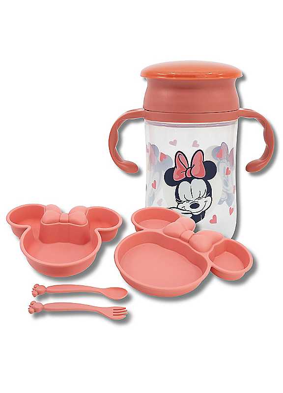 Make mealtime fun and safe with the Minnie Mouse Toddler Dinner Set! This adorable 5-piece tableware set includes a plate, bowl, and cutlery, all designed in the shape of Minnie Mouse, perfect for your little one's first dining experiences.Safe for use in the microwave (up to 2 minutes), this set is ideal for toddlers aged 10 months and up. Plus, it's BPA-free, ensuring peace of mind with every meal. The set also features a Minnie Mouse Training Mug, designed to help your toddler transition to drinking from a conventional mug. With a 360-degree drinking edge, your little one can sip from any side, and the handy handles and lid help prevent accidental spills.Wash Before First UseHand Wash OnlyMug Capacity: 395 mlEasy to clean: Make cleanup a breeze!BPA Free: Safe and worry-freeThis officially licensed Minnie Mouse set is not only fun but also practical, making mealtime enjoyable for both you and your toddler!Box Set dimensions approx. 20.9 x 8.5 x 24 cmToddler Mug approx. 19.5 x 6.5 x 12.8 cm