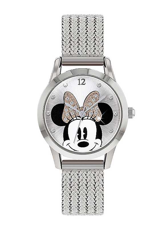 Disney Minnie Mouse Silver Stainless Steal Mesh Strap Watch. Featuring a Minnie Mouse character dial with stone set markers and stone set bow detailing. Packaged in a branded tin box and comes with one year guarantee.Official DisneyStainless steel mesh strapMinnie Mouse character dial