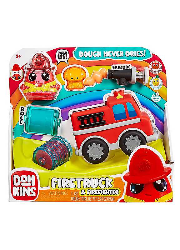 Be the hero with the DohKins Fire Truck! This fun play pack features our Never-Dry Dough that always stays soft, is gluten-free, and smells great - perfect for sculpting and squishing. Use the included character moulds and accessories to create your firefighter and puppy, or shape the dough into anything you can think of!The whimsical world of DohKins introduces fun, hands-on play that helps children express themselves with imagination and inspiration. At the same time, kids can build their fine motor skills with tactile play that keeps them entertained for hours.Build your own dough world with DohKins as you follow along with the animated series on MGA's YouTube channel. Make It! Mould It! Shape It! It's your creation!Age suitability: 3+ years