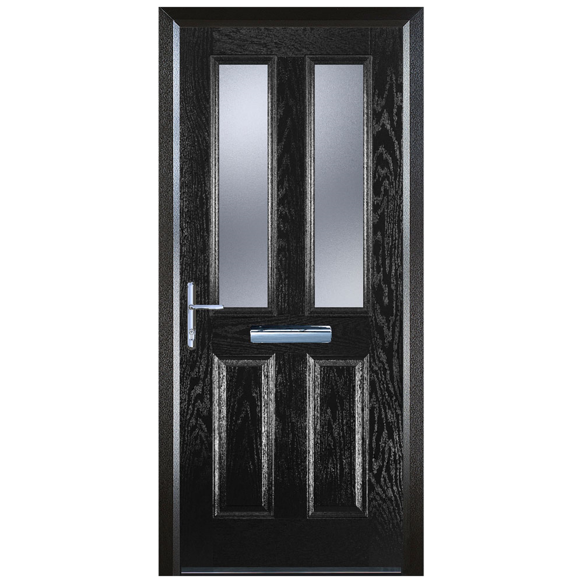 Door-Stop 2 Panel 2 Square Black Right Hand GRP Composite Door with Stippolyte Glass & Colour-Matched Frame - 840 x 2100mm - Door-Stop 2 Panel 2 Square Black Right Hand Composite Door is designed to elevate both style and functionality within your home. This door combines minimal maintenance with durable construction for lasting performance. With its elegant design, this door adds a touch of sophistication to any entryway. The sleek black colour exudes confidence and style, making a bold statement that complements both traditional and contemporary homes alike. This door offers exceptional strength, stability, and security. Easy to install and its smooth surface is easy to clean, allowing you to enjoy its pristine appearance with minimal effort. Supplied with a colour-matched frame.