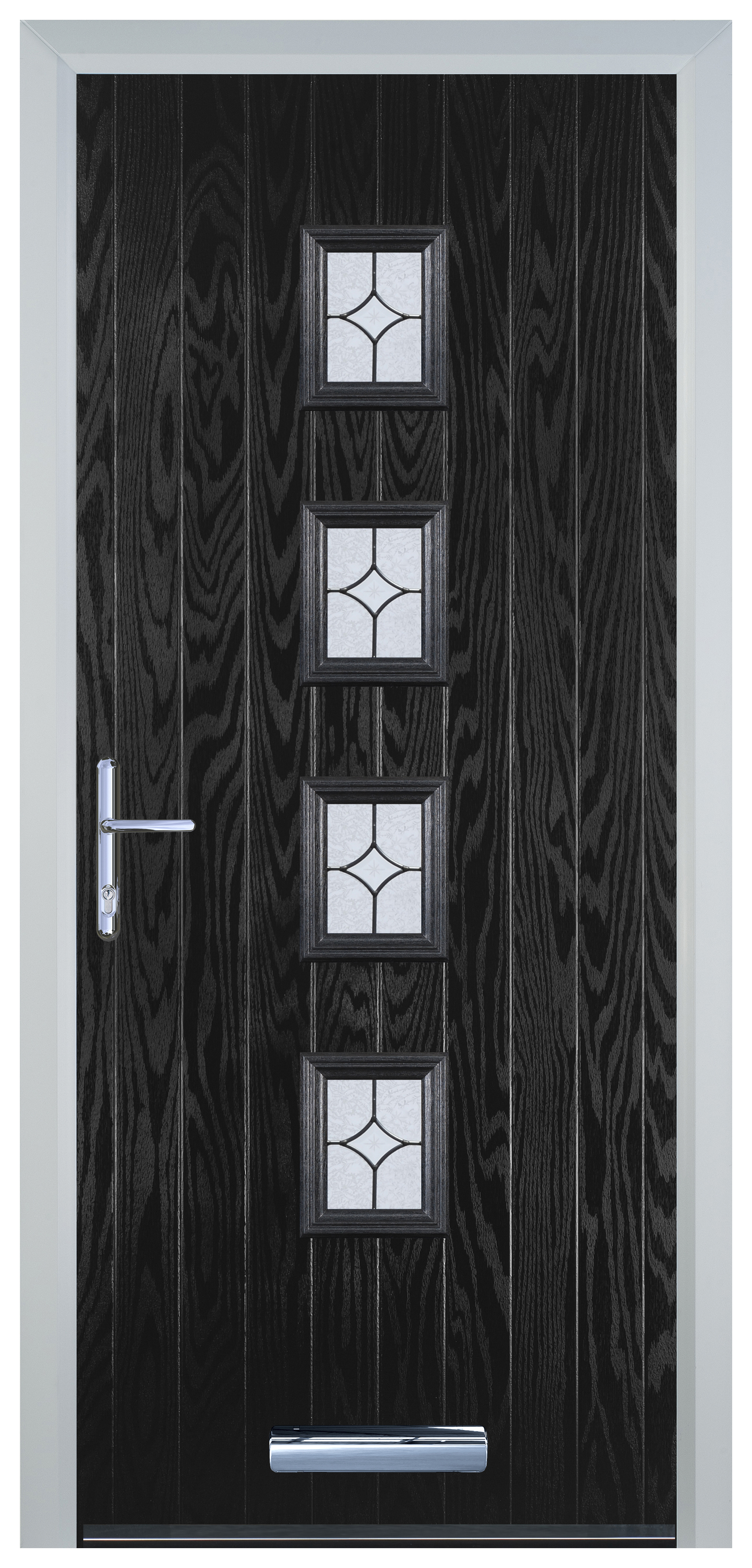 Door-Stop 4 Square Black Right Hand GRP Composite Door with Flair Glass - 920 x 2100mm - Door-Stop 4 Square Black Right Hand Composite Door is designed to elevate both style and functionality within your home. This door combines minimal maintenance with durable construction for lasting performance. With its elegant design, this door adds a touch of sophistication to any entryway. The sleek black colour exudes confidence and style, making a bold statement that complements both traditional and contemporary homes alike. This door offers exceptional strength, stability, and security. Easy to install and its smooth surface is easy to clean, allowing you to enjoy its pristine appearance with minimal effort.