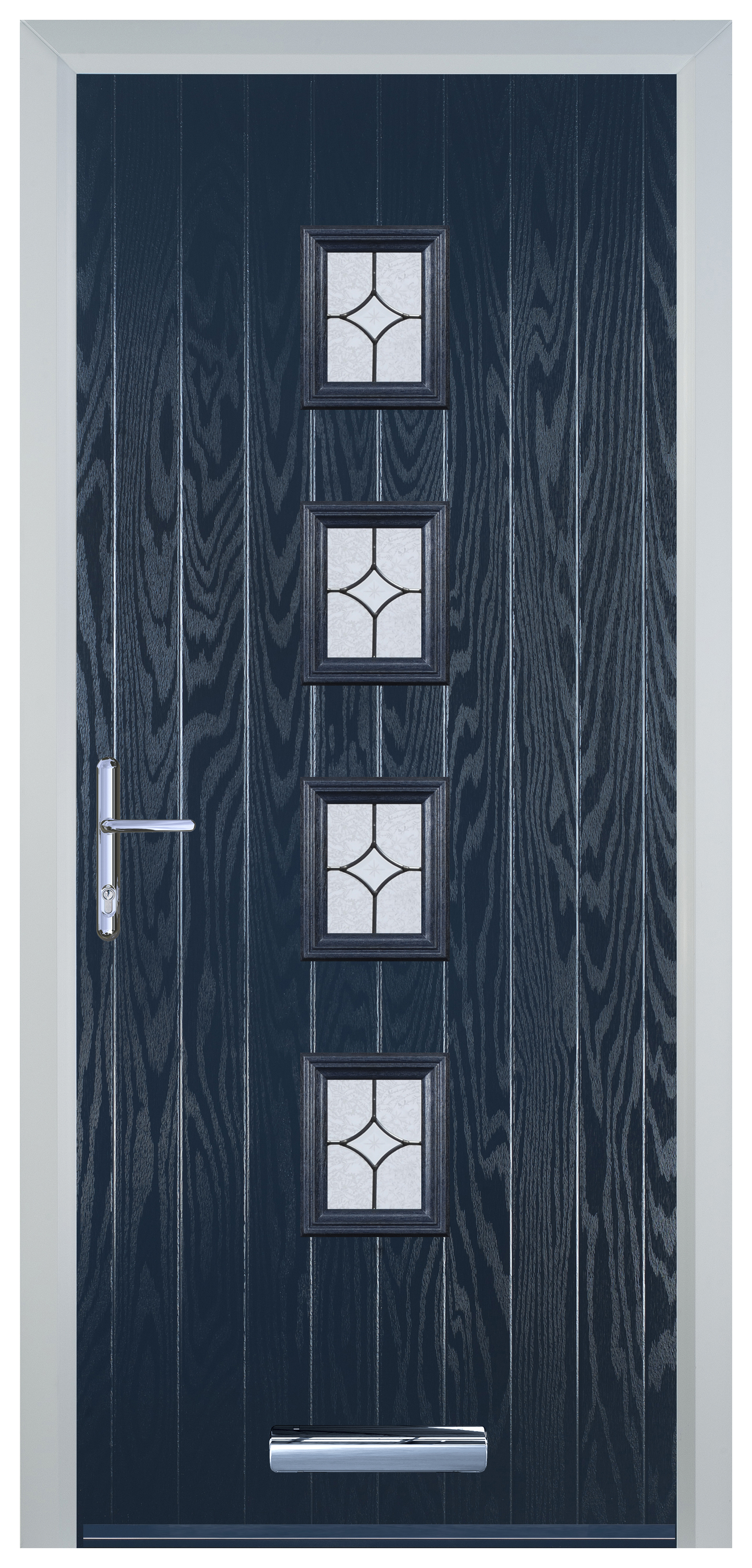 Door-Stop 4 Square Blue Right Hand GRP Composite Door with Flair Glass - 840 x 2100mm - Door-Stop 4 Square Blue Right Hand Composite Door is designed to elevate both style and functionality within your home. This door combines minimal maintenance with durable construction for lasting performance. With its elegant design, this door adds a touch of sophistication to any entryway. The rich blue colour adds a touch of sophistication and serenity to your home's exterior, creating an inviting focal point. This door offers exceptional strength, stability, and security. Easy to install and its smooth surface is easy to clean, allowing you to enjoy its pristine appearance with minimal effort.