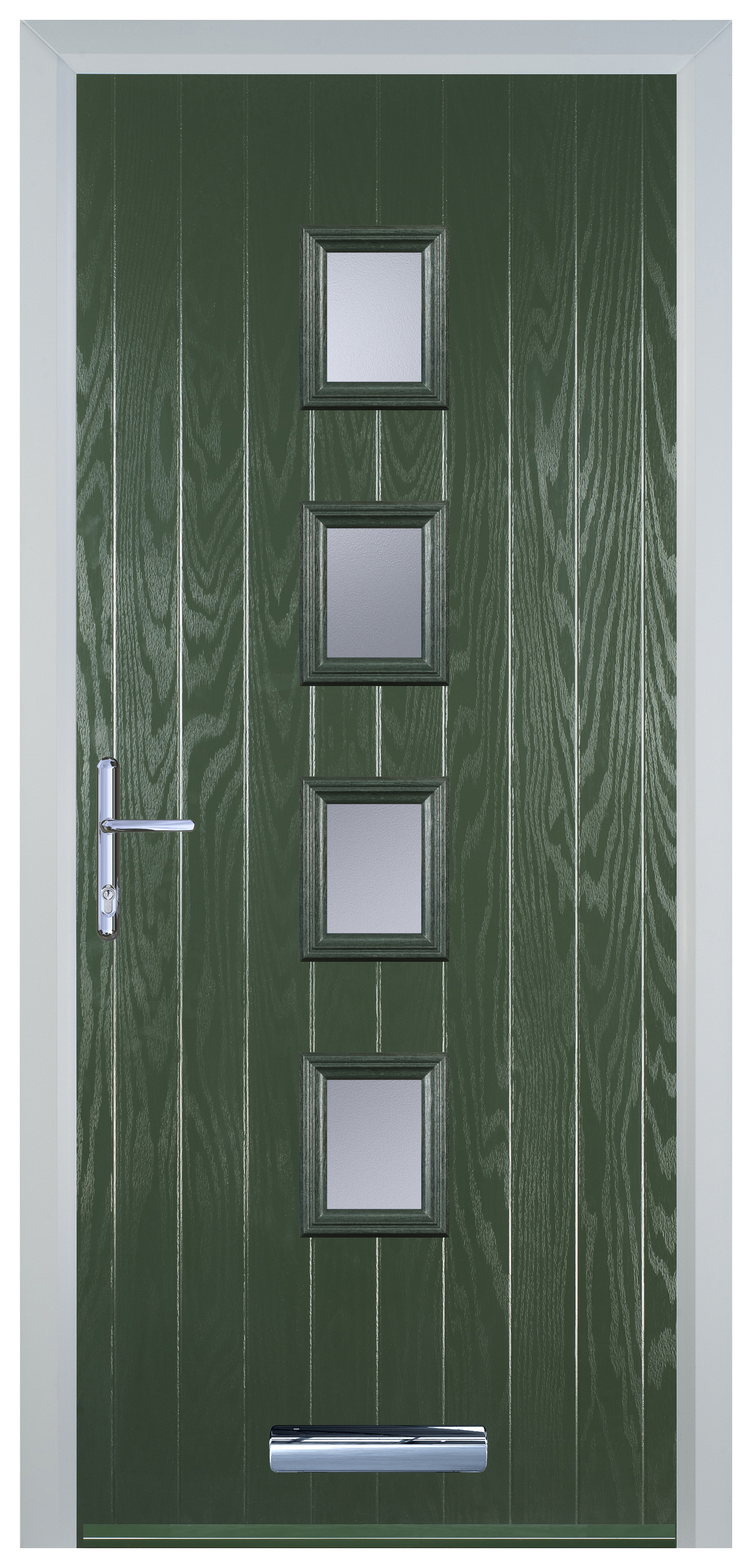 Door-Stop 4 Square Green Right Hand GRP Composite Door with Stippolyte Glass - 920 x 2100mm - Door-Stop 4 Square Green Right Hand Composite Door is designed to elevate both style and functionality within your home. This door combines minimal maintenance with durable construction for lasting performance. With its elegant design, this door adds a touch of sophistication to any entryway. The refreshing green colour brings a sense of tranquility and vitality to your home's exterior, creating an inviting atmosphere. This door offers exceptional strength, stability, and security. Easy to install and its smooth surface is easy to clean, allowing you to enjoy its pristine appearance with minimal effort.
