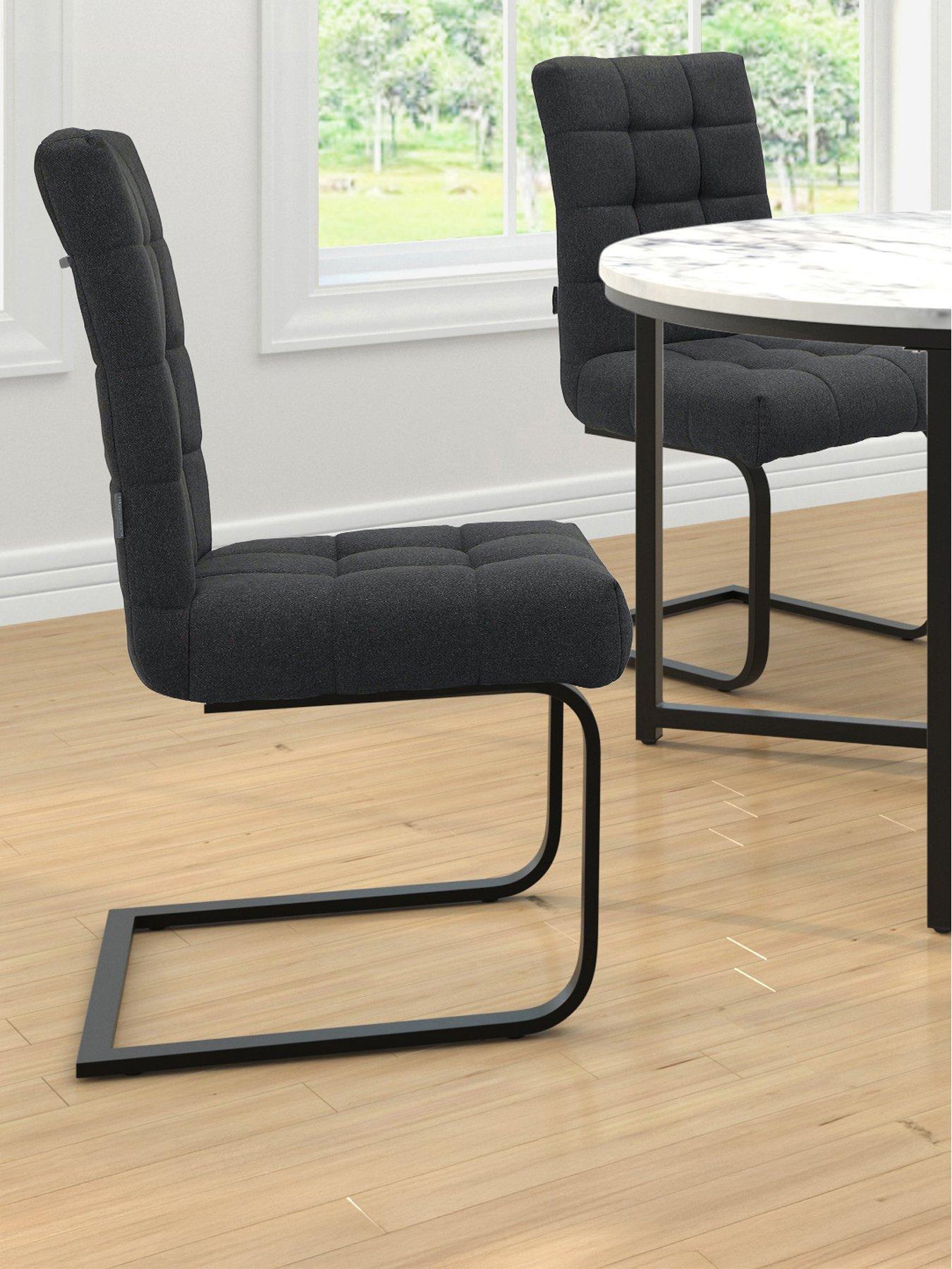 Dorel Home Terza Set Of 2 Upholstered Dining Chairs This Set Of Two Chairs Features A Sleek, Contemporary Design That Combines Comfort With Modern Aesthetics. Each Chair Is Upholstered In Soft, Black Fabric With A Stylish Grid-Tufted Pattern On The Seat And Backrest, Adding Texture And Visual Interest. The High Back Provides Ergonomic Support, While The Cushioned Seat Ensures Comfort For Extended Sitting. The Chairs Are Supported By Black Cantilever-Style Metal Frames, Creating A Minimalist Yet Sturdy Base That Enhances Stability And Adds A Chic Industrial Touch. Perfect For Dining Rooms, Offices, Or Meeting Spaces, These Chairs Offer A Blend Of Functionality And Elegance For Any Modern Interior. Assembly: Self Assembly Material Content: Polyester / Metal Set Of 2 Dining Chairs Modern Cantilever Design With Iron Frame For Stability And Style Softly Padded Seat And Backrest With Elegant Square-Patterned Upholstery Practical Backrest Handle For Easy Movement And Arrangement Wipe Clean With A Damp Cloth Chair Height (In Cm): 95 Chair Width (In Cm): 47 Chair Depth (In Cm): 59 Chair Seat Height (In Cm): 49 Chair Weight (In Kg): 10