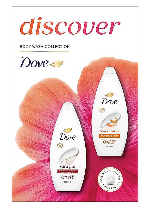 Know someone who's into confidence-inspiring natural beauty in a big way? You've just found the perfect gifts for her. Dove believes that beauty is not defined by shape, size or colour. It's about feeling like the best version of yourself. Authentic. Unique. Real. That's why the Dove Discover Duo Gift Set includes a luxury shower puff and two Dove products that transform her daily routine into a caring ritual and leave her feeling naturally beautiful all day. Made with 100% gentle cleansers, plant-based moisturisers and 0% sulfate SLES, Dove Velvet Glow and Fruity Nourish Body Washes ensure her microbiome (her skin's living protective layer) is given the nutrients it needs to protect itself and minimise skin dryness. Dove Velvet Glow wraps her in a cloud of rich, floral-scented lather for a soothing sensory experience that helps her truly unwind. Dove Fruity Nourish transforms into a soft, fruit-scented lather that effectively washes away impurities and nourishes her skin, leaving it softer and smoother after just one shower. No matter the occasion, help her look and feel her best with this body wash collection. It's the perfect stocking filler, birthday treat or all-year-round gift. Caring for her never felt so good. *within the stratum corneum