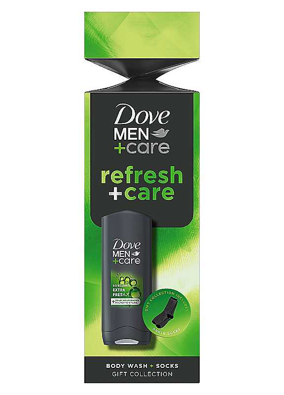Looking for something special for a man who likes to take great care of himself? Look no further than the Dove Men+Care Refresh+Care Body Wash & Socks Gift Set. Because we believe that care makes a man stronger, this set of gifts for men includes a full-size Dove Men+Care Refreshing Extra Fresh 3-in-1 Hair, Body & Face Wash 250ml and a pair of chunky socks (in size 7-11) that team up to protect his skin and keep him stylish and comfortable all day. Not only does the body wash leave him feeling re-energised with an invigorating masculine scent, but it also acts as a moisturiser thanks to 24-hour MicroMoisture technology, providing continuous nourishment throughout the day and giving him healthier, smoother skin after just one shower. Plus, it saves space in his bathroom or sports bag. Help him feel his best no matter the occasion with Dove Men+Care. By bringing you this gift set, we celebrate a new definition of strength: one with care at its centre. Packaged in a stylish cracker-shaped box, it's the perfect stocking filler, birthday treat or all-year-round gift. Our gift sets are engineered for men, so you know he'll have comfortable, cared-for skin that's reliably fresh all day. | body lotion for all skin types, cleanser for all skin types, dove men care body and face wash, body wash gift sets, moisturiser for all skin types, dove men care soap, skin care products for all skin types, dove men body wash, dove men care body wash, mens moisture wicking socks, bed socks men, crew socks mens, sport socks men, cosy socks for men