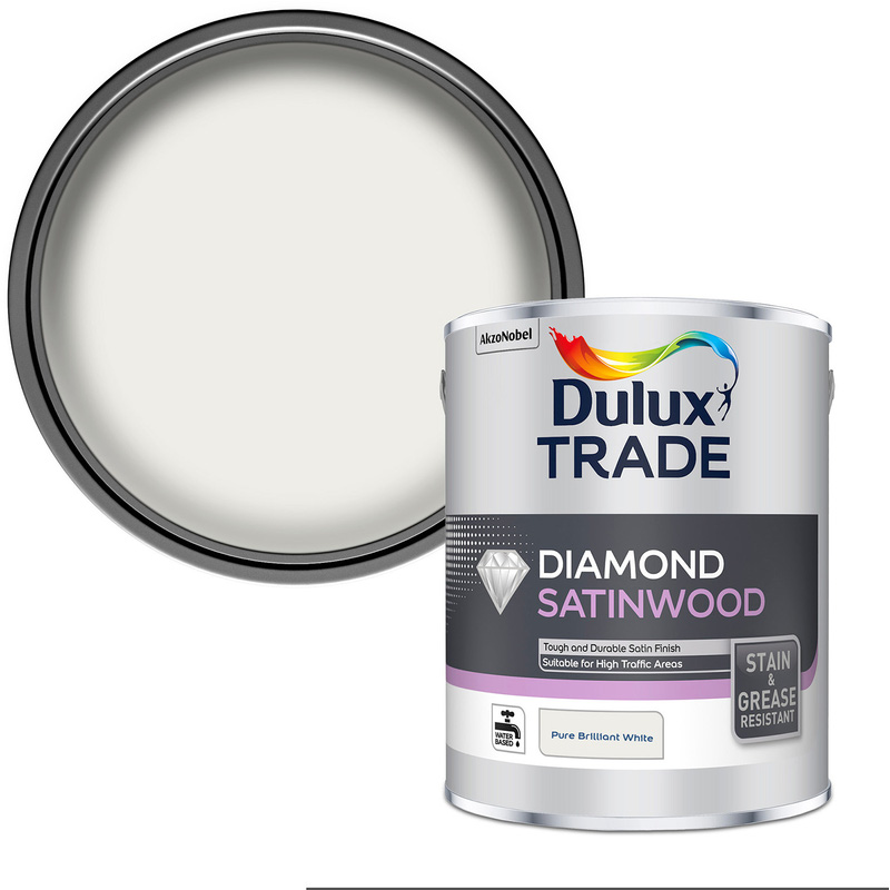 * Tough, durable and non-yellowing * Suitable for high traffic areas * Stain and grease resistant * Water based * Suitable for interior use | Dulux Trade Diamond Satinwood Paint Pure Brilliant 2.5L in White