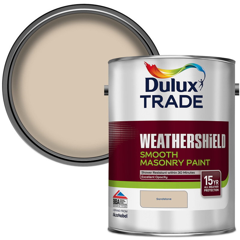 * Superior protection from mould & algae * Anti-fade Technology for longer lasting colour * 15 years protection (BBA approved) * Water based * Suitable for exterior use | Dulux Trade Weathershield Smooth Masonry Paint 5L in Sandstone