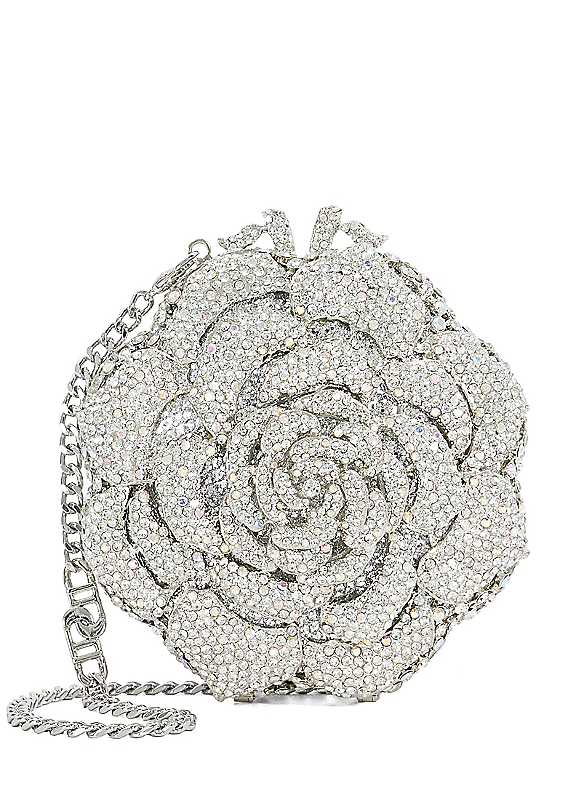 Meticulously crafted and designed in-house, this beautiful and unique flower clutch sparkles with clusters of shimmery diamantes set in gold casing, embodying romantic glamour. The hard casing opens to reveal gold lining and one central compartment. The gold chain strap allows you to wear this bag on your shoulder or carry it as a hand-held clutch.MetalDimensions approx. 8 x 12 x 1 cm