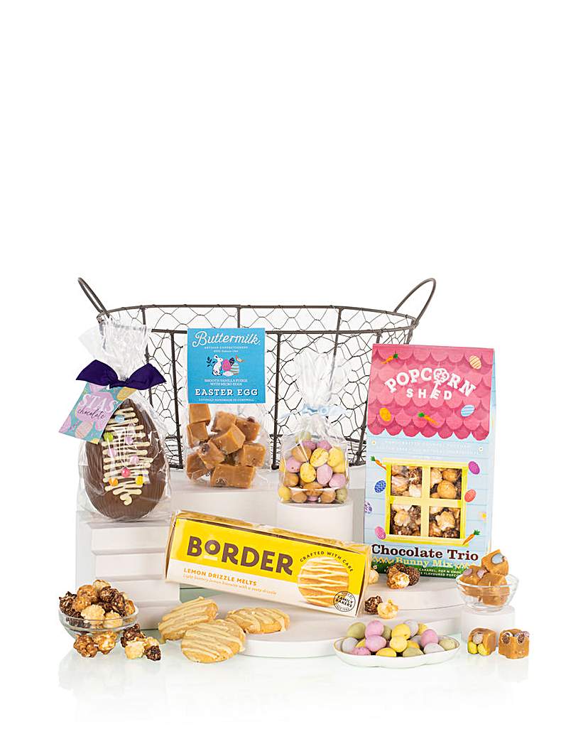 Brighten Easter celebrations with our delightful Easter Gift basket, filled with chocolatey favourites and sweet treats. Featuring Stas Chocolatier Eggs, Popcorn Shed Chocolate Trio Bunny Mix, Buttermilk Easter Fudge and Border Lemon Drizzle Melts, this charming wire mesh basket is ready to delight adults and children alike. Includes: Border Lemon Drizzle Melts 150g. Buttermilk Easter Egg Fudge 175g. Popcorn Shed Chocolate Trio Bunny Mix 80g. Stas Easter Egg with Candy Beans 100g. Stas Chocolatier Mini Eggs 150g. Wire Mesh Oval Storage Basket. Please note we are unable to deliver this item ROI or Northern Ireland.