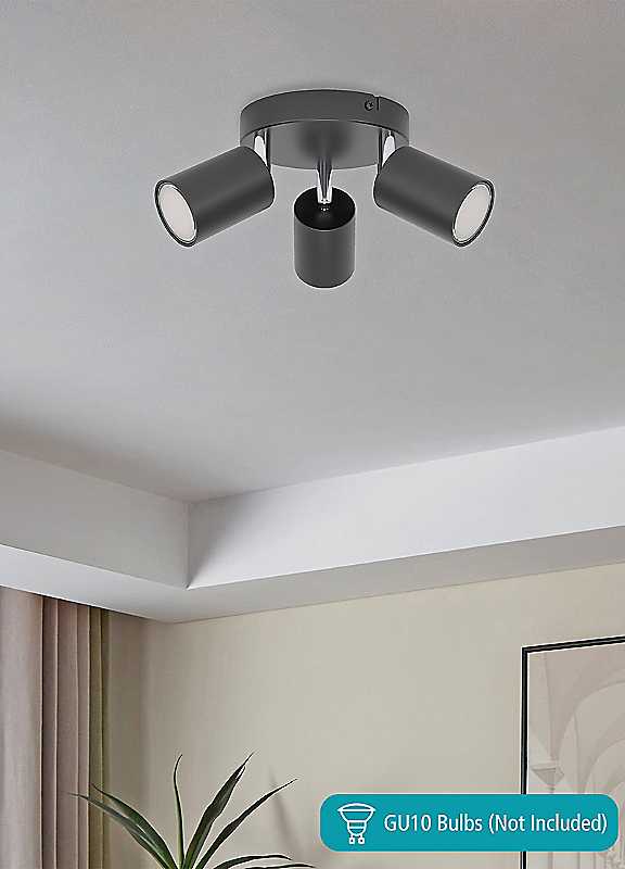 The Reciso-E spot trio is a lighting solution designed for indoor spaces. With a black steel enclosure, this spot effortlessly enhances any interior while maintaining a sleek and modern design. It's ideal for bedrooms, living rooms or any living room. Bulb not included 3 x GU10 Lightbulb Required, 3 x 5 W Black Steel & Plastic Body IP20 Protection Triple light source Dimensions approx. 8.5 x 14 x 8.5 cm | black dining room light fixtures, black spot light, black lamps for bedroom, contemporary home lighting, industrial style lighting, steel lighting, bedroom light fixtures, modern style light fixtures, black light fixtures, ceiling mount light fixture, minimalist lighting, wall lights spotlights