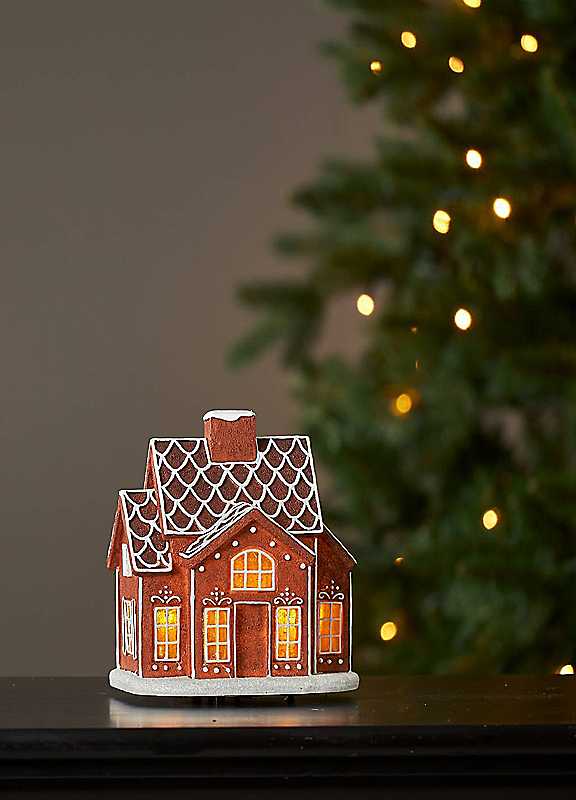 Introducing the Gingerville LED Gingerbread House: Crafted from brown plastic adorned with delightful icing-like details, this charming gingerbread house brings the magic of Christmas to life. The integrated LEDs emit a warm white light, beautifully illuminating the house's windows. Whether placed in your living room or dining area, its classic design blends into any home decor. And here's the festive touch: the integrated timer allows the light to automatically switch on for six hours daily. Let the Gingerville Gingerbread House fill your home with holiday cheer!Brand: EGLOFestive charmWarm white glowMagical timerBattery poweredNostalgic appealHoliday atmosphereRequires AAA batteries (not included)Bulb with max wattage: LED 6WBulb includedSuitable for indoor use onlySpecifications material: PlasticDimensions approx. 16H x 9.5W x 14D cmPlease note: The images of the products on our website are for illustrative purposes. We endeavour to display as accurately as possible the colours of our products on our website, however, as different computers and mobile devices display colour tones differently we cannot guarantee the complete accuracy of the pictures or photographs that are shown