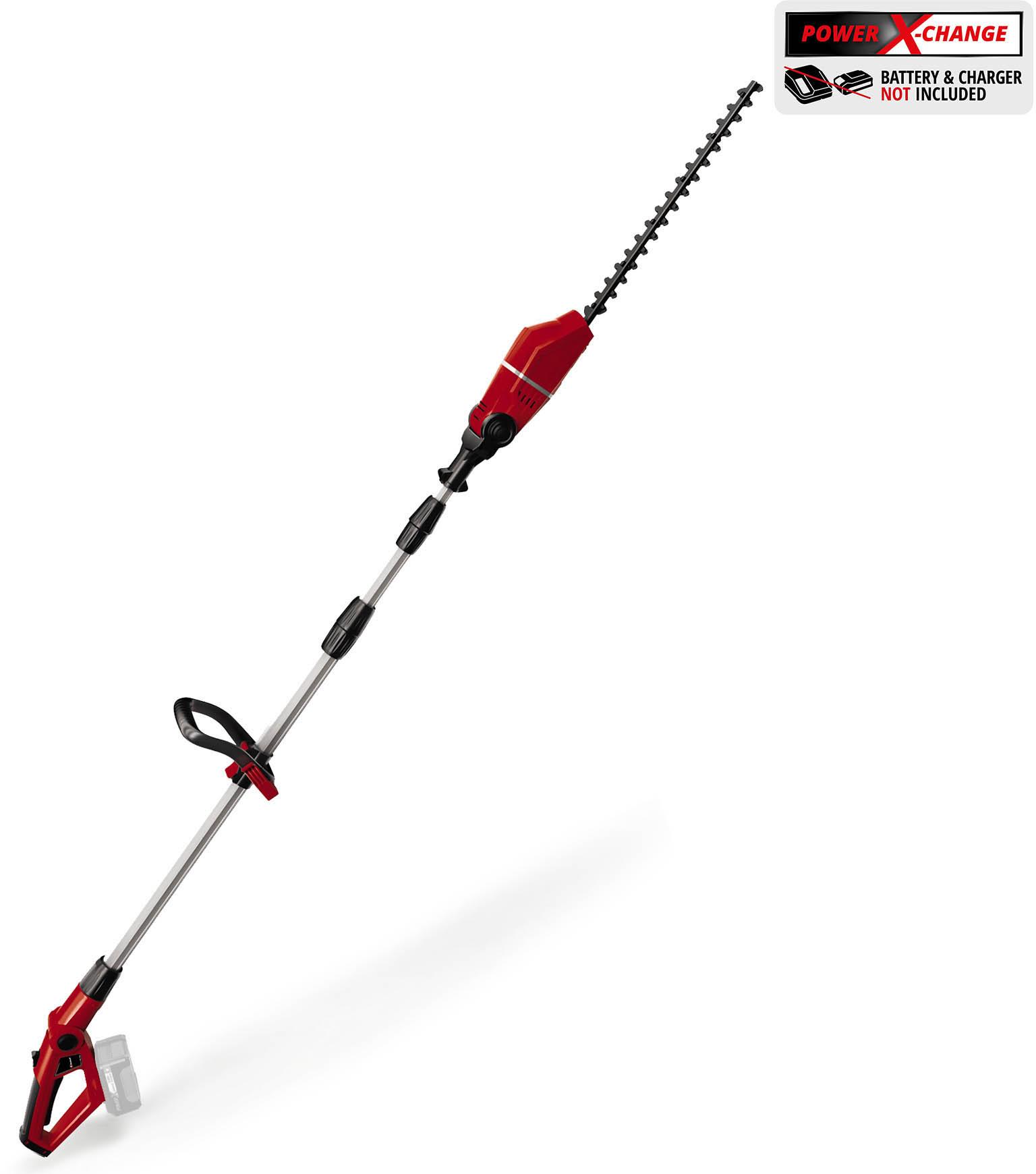 The rechargeable high-hedge trimmer GE-HH 18/45 Li T is a very powerful device supporting you at power network-independent maintenance of hedges, shrubs and bushes on large plots and in allotment gardens. The metal gearbox provides long duration, and the knives made of laser-cut and diamond-grind steel provide clean cutting results. Because of their versatile settings, this shrub shears can be adjusted to each working situation quickly and simply. Battery and charger are not included in delivery.