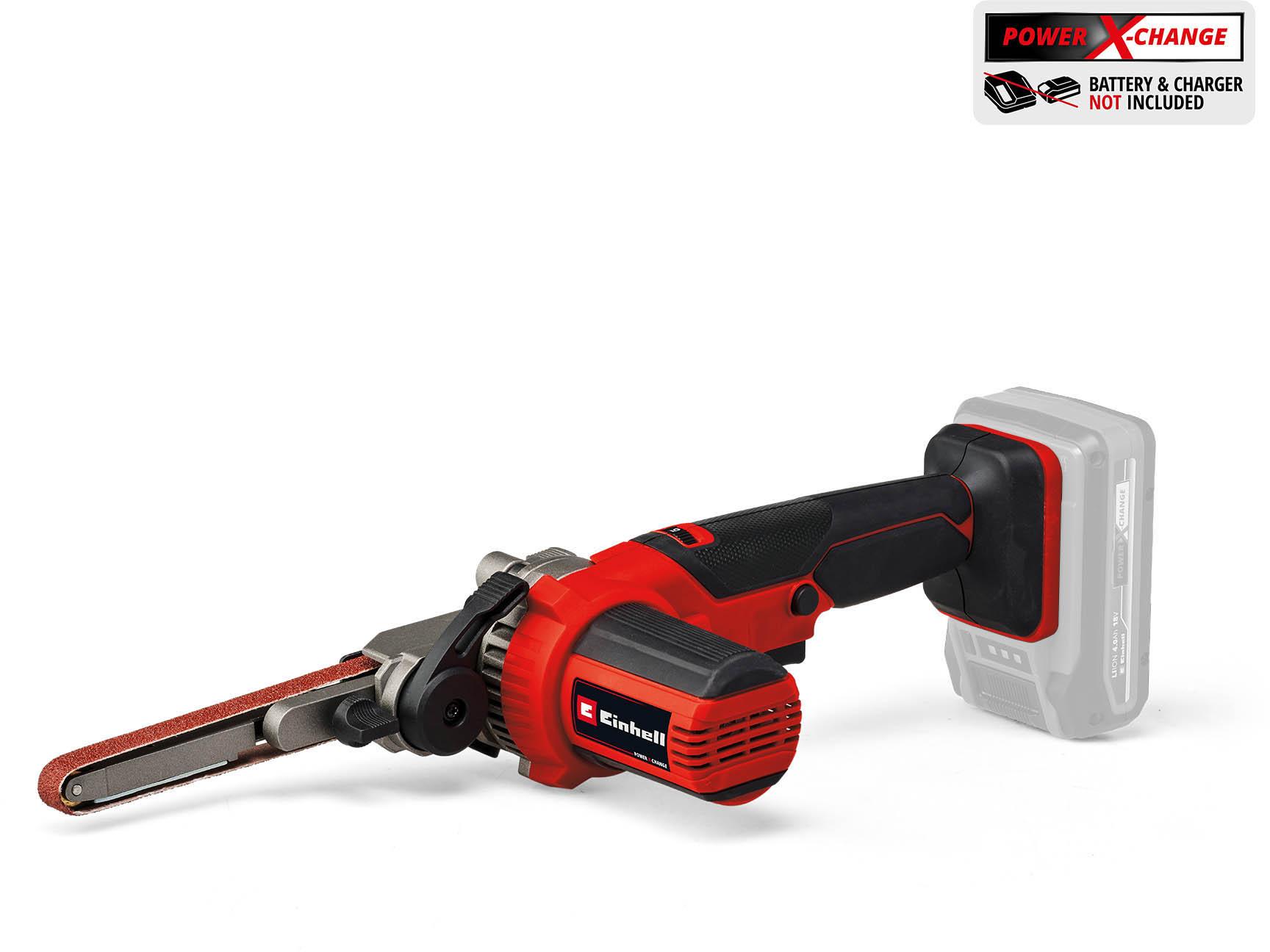 The Einhell Power X-Change cordless bandfile TE-BF 18 Li-Solo is an easy-to-use tool for grinding and deburring. The belt file can be used with any Power X-Change battery or charger. It also comes with two interchangeable grinding arms (9 mm and 13 mm). The grinding arm can be pivoted up to 90°. The speed of the sanding belt (250 - 1,700 m/min) can adjusted to the material via speed control, meaning the tool can handle a wide variety of materials. No tools are required to change or adjust the grinding belts. The product includes a suction adapter, a 12-piece set of grinding belts in two different widths (length 457 mm, 2x P60, P80, P120 grit each) and a practical pouch. Battery and charger not included.