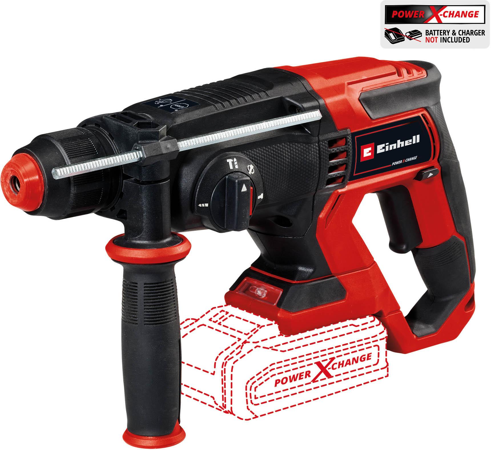 The Einhell cordless rotary hammer TE-HD 18/20 Li-Solo is a powerful member of the combinable Power X-Change family. It combines the four functions of hammer drilling, drilling and chiselling with and without fixing. The pneumatic impact mechanism ensures 1.8 J impact The device drills holes with diameters of up to 30 mm in wood, 20 mm in concrete and 13 mm in metal. With all the power, the speed electronics ensure material- and application-appropriate work. The rotary hammer is equipped with an SDS-plus tool adapter with semi-automatic operation, an additional handle, softgrip surfaces, an adjustable depth stop and an LED light. Supplied without battery or charger.