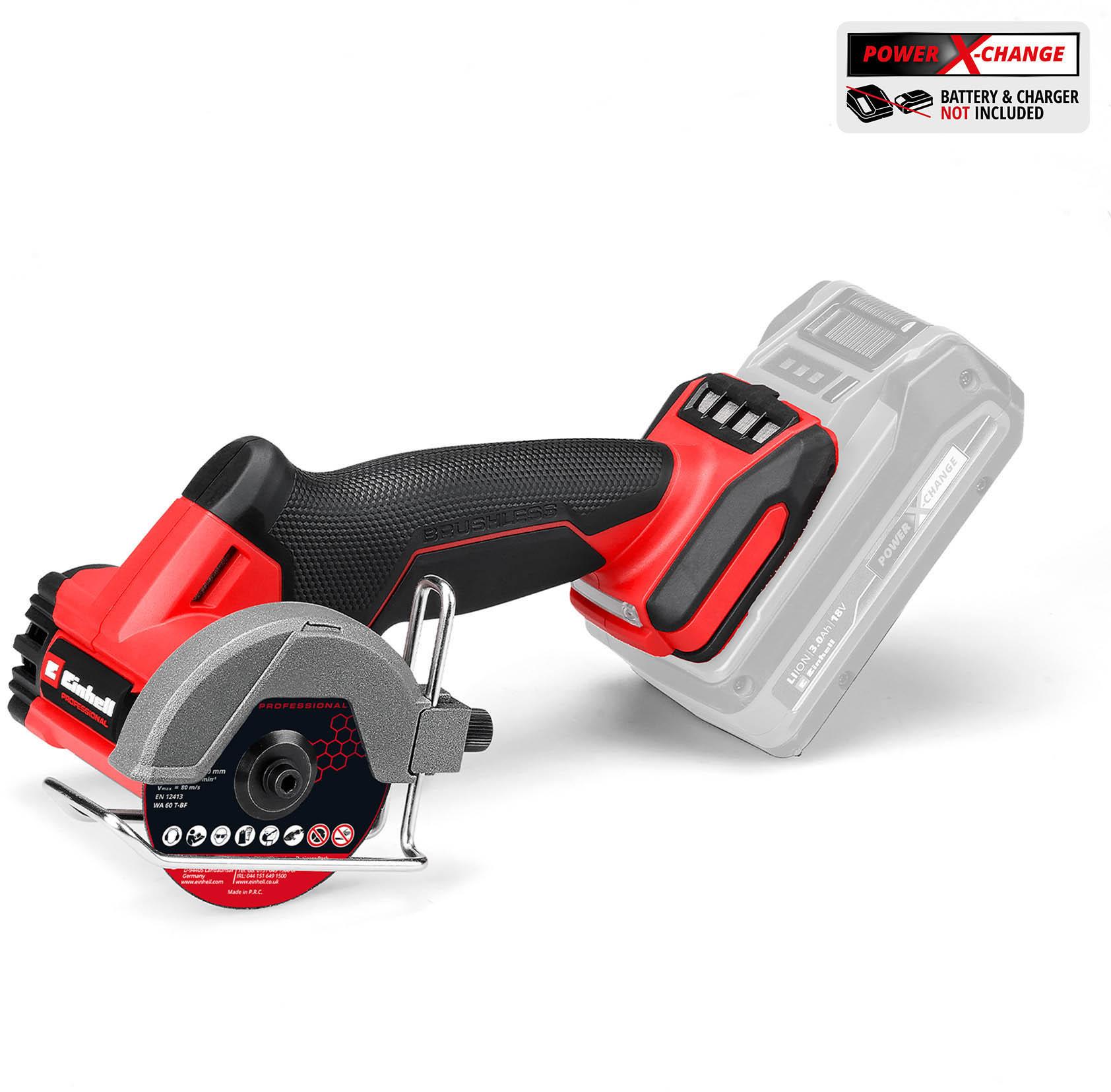The Einhell Professional cordless cut-off tool TP-CO 18/76-C Li BL-Solo is part of the Power X-Change family. The tool is driven by a brushless motor for enhanced power and longer runtimes. Once you register online, the brushless motor has a 10-year warranty. The cut-off grinder can be utilised with 76 mm cutting discs and the cutting depth is adjustable up to 16 mm without tools. The compact device is equipped with rpm speed electronics and an integrated LED light. The cutting disc guard can be adjusted without tools and the motor brake ensures that the cutting disc comes to a quick stop. Including 1x diamond cutting disc and 3x metal cutting disc. Battery and charging device not included.