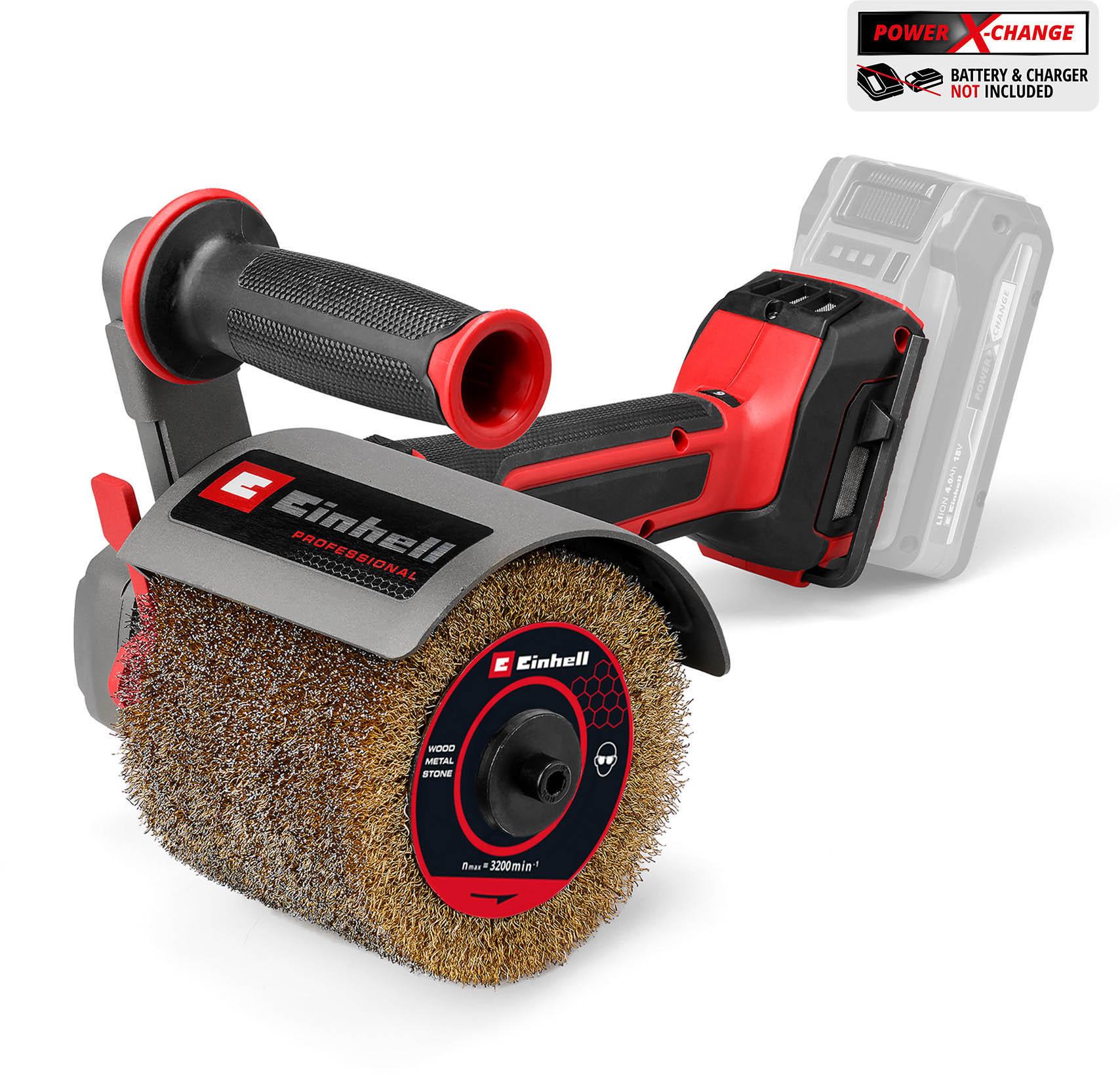 The Einhell Professional cordless brush sander TP-BR 18/32 Li BL-Solo is a versatile tool for sanding, polishing and cleaning, for example, wood, metal and hard-wearing stone. The tool is driven by an Einhell Brushless motor for extra power and longer running time. Once you register online, the brushless motor has a 10-year guarantee. The Power X-Change cordless brush sander comes with a brass wire brush, other brushes are available separately. The power can be regulated via electronic speed control. The handy design makes it possible to work close to edges. Removable dust screens protect the inside of the tool from contamination. Battery and charger not included.
