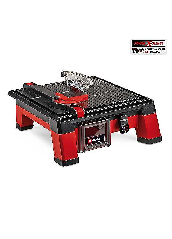The Einhell TE-TC 18/115 Li-Solo tile cutting machine, being powered by a rechargeable battery from the high-performance Power X-Change family, is a 'lightweight' among tile cutters and can be used with flexibility anywhere and everywhere - far away from any sources of electricity such as socket outlets or generators. The batteries with the high-grade lithium-ion cells can be combined with all members of the Power X-Change family. The rechargeable batteries from the Power X-Change series are available separately, e.g. As a practical starter set.The tile cutting machine has a table which can be tilted and which has an angle scale from 0° to 45°, plus an adjustable angle stop for mitre cuts with settings from 0° to 90°. The maximum cutting depth at 45° is 16 mm and at 90° it is 24 mm. The parallel stop with scale is for performing exact straight cuts. An integrated water container provides the cutting disc with sufficient cooling during cutting, and a cutting wheel guard provides essential safety. Non-slip, low-vibration feet ensure a secure and steady standing position. For mobility the low-weight cordless tile cutter has a carrying option the product is supplied complete with a diamond cutting disc and tool.The Einhell TE-TC 18/115 Li-Solo cordless tile cutting machine, being powered by a rechargeable battery from the high-performance PXC family, is a 'lightweight' tool. The tile cutting machine has a parallel stop with a scale and a table which can be tilted and an angle scale from 0° to 45°. The adjustable angle stop has settings from 0° to 90° for mitre cuts. An integrated water container provides for cutting disc cooling, and for safety there is a cutting wheel guard. Non-slip, low-vibration feet ensure a secure and steady standing position, and a carrying option for easy transport.The product is supplied complete with a diamond cutting disc and tool. The rechargeable batteries from the PXC series are available separately.A member of the Power X-Change family, Flexible use everywhere due to battery motor & low weightTilting table with angle scale (0 - 45°), Integrated water tank for cutting disc coolingNon-slip and vibration rubber feet for secure hold, Parallel stop with angle scale for exact straight cutsAdjustable angle stop (0 - 90°) for mitre cuts, Carrying option for easy transportA cutting wheel guard provides the necessary safetyComplete with diamond cutting disc & a tool for changingSupplied without battery & chargerWeight approx. 3.5kgWork bench size approx. 305L x 335W mm