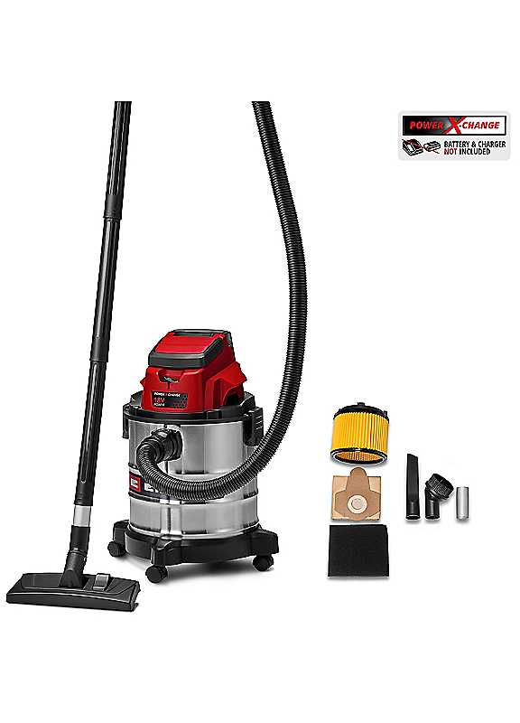 The Einhell cordless wet/dry vacuum cleaner TC-VC 18/20 Li S-Solo is a powerful member of the Power X-Change system, where batteries, chargers and tools can be flexibly combined across the system. The stainless steel container holds up to 20 litres, the 36 mm diameter hose system provides a high air and dirt throughput. The blowing connection is intended for blowing out hard-to-reach places, e.g. In corners, angles or under stairs. Four sturdy castors ensure good mobility and flexibility. The nozzles and suction pipes can be neatly stored away on the practical accessory holder. The scope of delivery includes 1.50 m plastic suction hose and three-part extension pipe, large combination, joint and upholstery nozzle as well as foam filter and pleated filter and dirt collection bag. The battery and charger are not included. These are available separately, e.g. As a starter set in various battery and accumulator capacities. Member of the Power X-Change family, 1 x 18 V battery required Stainless steel container with 20 L volume Blowing connection for blowing out hard-to-reach areas Carrying handle and four swivel castors for easy transport Practical accessories holder for clean storage and working 36 mm hose system for high air and dirt throughput Including 1.5 metre suction hose, 3 extension pipes Including large combination nozzle, joint nozzle and upholstery nozzle Including foam filter, pleated filter and dirt collection bag Delivered without battery and charger Recommendation for optimal results: 2.5 Ah battery and above