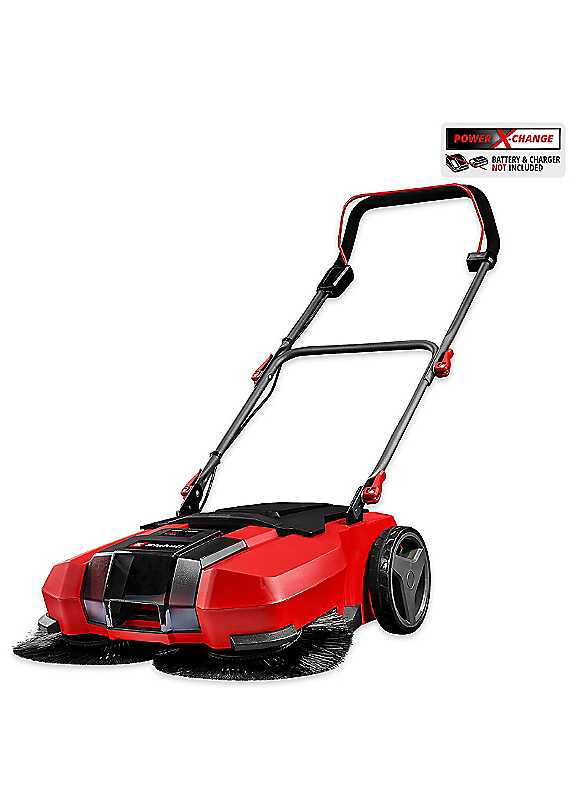 The Einhell TE-SW 18/610 Li-Solo cordless mechanical sweeper, as a member of the flexible Power X-Change family, is powerful, reliable and flexible. Every high-quality PXC rechargeable battery from the series can be combined with every system device. The rechargeable battery and charger are available separately, for example as a practical starter set.The cordless mechanical sweeper needs one 18v rechargeable battery for operation. Sweeping the drive and path can be a strain - but it need not be. The cordless mechanical sweeper assists on sweeping work, enabling you to sweep up without strain or effort using a battery-assisted drive of the brushes and motor. Especially for sweeping up large areas at up to 1,800 m2 per hour thanks to the 610 mm sweeping width, it makes light work of keeping large yards tidy. The cordless mechanical sweeper enables every edge to be reached with the brush positioned on the side. For sweeping up on really uneven areas, the lip is removable. The on/off switch is easy to reach as it is on the handle itself. The swivel rollers ensure easy handling whatever the surface.With large wheels and an ergonomic shape, the cordless mechanical sweeper is easy to transport. The cordless mechanical sweeper has a base area and an adjustable guide for easy storage. Complete with a high-quality 20 Litre dirt tank that can be set down securely. Supplied without a PXC rechargeable battery or charger. The Einhell TE-SW 18/610 Li-Solo cordless mechanical sweeper is a member of the flexible PXC family. The battery and charger are available separately.The cordless machine needs one 18 v rechargeable battery. The mechanical sweeper assists on sweeping work, enabling you to sweep up without strain or effort using a battery-assisted brush-drive, right up to the edges thanks to the brushes positioned on the side.Especially for sweeping up large areas at up to 1,800 m2 per hour thanks to the 610 mm sweeping width, it makes light work of keeping large yards tidy. The on/off switch is located on the handle itself. For easy handling it has large swivel rollers and an ergonomic shape. Complete with a 20 Litre dirt tank that can be set down.