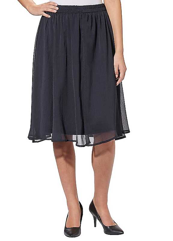 Truly feminine! Wide skirt in light chiffon fabric and comfortable slip-on design with fully elasticated waistband. Slightly shorter, opaque lining. Flowing chiffon fabric Opaque lined No pockets No fastening Washable 100% Polyester Lining: 100% Polyester Length approx. 68 cm (26¾ in)