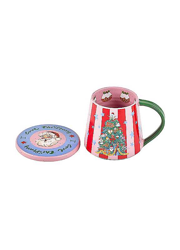 Cosy up this Christmas with this Eleanor Bowmer Fabulously Festive Hot Chocolate Mug & Coaster set. The ceramic mug features a vibrant red and pink striped design, adorned with a beautifully decorated Christmas tree scene. It comes with a matching coaster, featuring a joyful Santa illustration and the phrase 'I Love Christmas', all designed to keep your surfaces safe while adding a colourful touch to your festive sips. Finished in a beautiful window box, perfect for gifting.100% StonewareDishwash & Microwave Safe | christmas tree mug, holiday mugs, cute mugs, cute coffee mugs, christmas coffee mugs, hot coffee mug