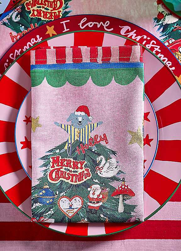 Embrace the joy of the season with this Set of 4 Christmas Tree Napkins. These charming napkins feature Eleanor Bowmer's beautifully illustrated, fully decorated Christmas tree, brimming with festive details and set against a soft pink background with gold stars. Framed by a red and pink stripe border and a playful green scalloped edge, these napkins are perfect for adding a touch of elegant Christmas cheer to your dining table.Pack of 4Cold machine washableLow tumble dry100% CottonSize approx. 45 x 45 cm